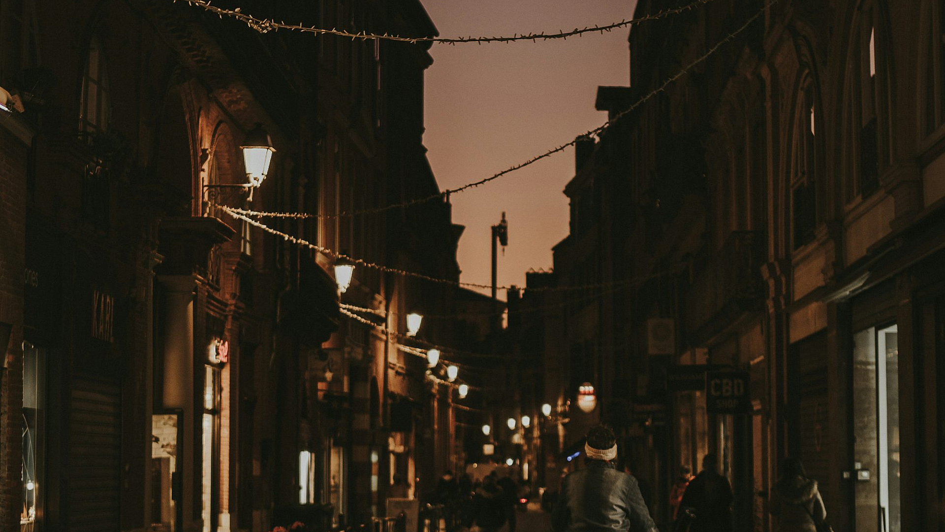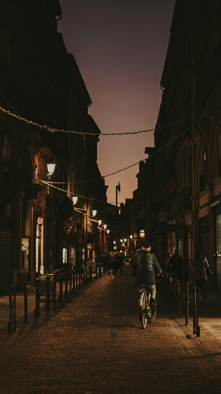 This wallpaper features a captivating image of a man riding his bike down a dimly lit street at night. The scene is shrouded in darkness, creating a mysterious and atmospheric feel. The cyclist is silhouetted against the city lights, adding to the overall sense of movement and intrigue. The use of shadows adds depth and contrast to the image.