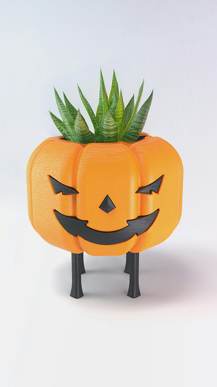 A pumpkin shaped planter with a plant growing out of it